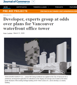 We wish to express our strong opposition to the preliminary development application for an office tower at 601 West Cordova Street. We are most disappointed that this proposal is coming to the Heritage Commission for the fourth time over the last 12 years, as it is disrespectful of your volunteer time, the public’s time and that of staff and Council. Read DWWG letter here.